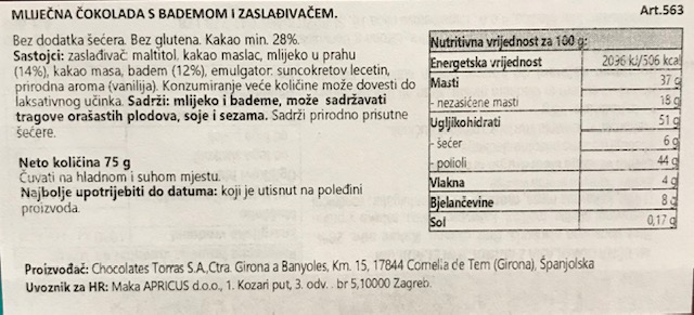 Mliječna čokolada s bademom i zaslađivačem / bez glutena